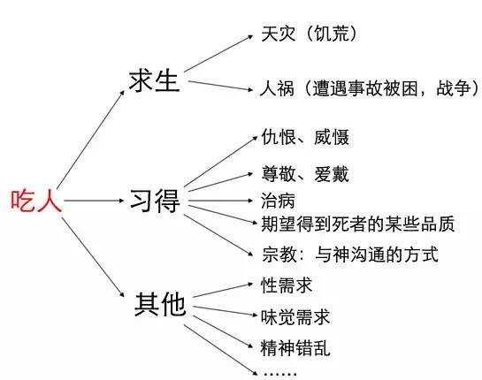 秀色:如果說冰戀是把人弄死來睡,那秀色就可以理解為把人弄死來吃。要歸納出所有的食人行為大致可以分成以下三種(如圖),求生性食人、習得性食人、以及歸分為其它類型的特殊性食人。